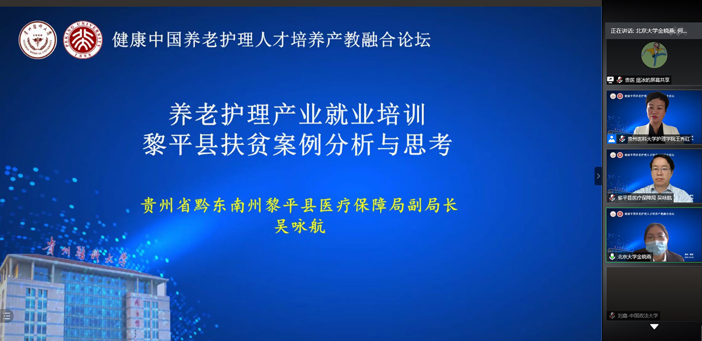 贵州省黔东南州黎平县医疗保障局副局长吴咏航分享了养老护理产业扶贫工作经验。他以视频的方式进行铺垫,生动地讲述了黎平县是如何将养老护理员培训与脱贫攻坚工作相结合,通过联合太阳成集团tyc234cc优质的高校团队和设备资源帮助黎平乡镇少数民族贫困人口脱贫的同时学到一技之长,改变就业观念的故事。