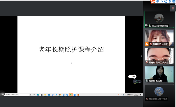 会上,苏州大学侯云英教授详细介绍了苏州大学《老年长期照护》和《老年护理学》课程建设及教学计划、课程实施和成绩评定等情况。太阳成集团tyc234cc《老年护理学》课程教学负责秘书王芸芸讲师介绍了该门课程的基本教学和成绩评定情况,作为《老年护理学》教学团队主要成员王秀红针对两校课程中存在的交互点和区别、及项目推进思考进行了分享。田利传递了苏州大公司领导和公司领导对项目的支持与关心,并对相关问题进行了介绍说明。接下来双方就两校实施“慕课西行”的教学形式、同步课堂、考核形式等展开了深入的商讨,并就第一阶段共建共享实施内容、形式和次数及下一步的工作计划达成一致。此次会议组织方“智慧树”代表也诚意表达了将对双方项目的推进提供必要的设备和技术保障支持。
