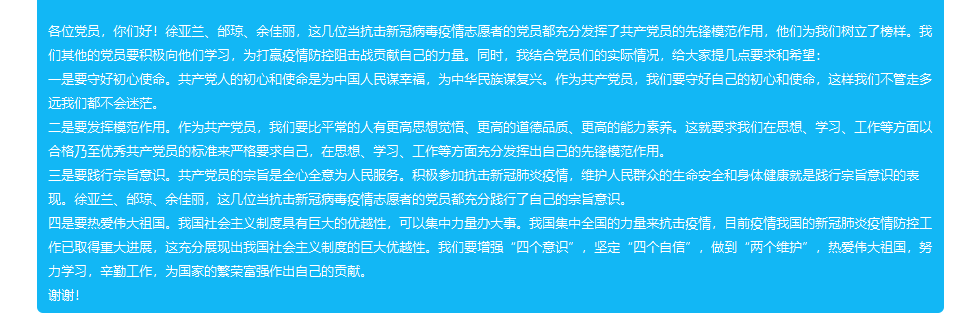余佳丽在分享自己的战“疫”事迹时说:“作为一名正在实习的医员工和员工党员,这样的双重身份,面对当前疫情我责无旁贷,看到前辈们驰援一线,让我想起刚入校门时的医员工誓言:我志愿献身医学,热爱祖国,忠于人民,恪守医德,尊师守纪……习近平总书记强调,我们要按照坚定信心、同舟共济、科学防治、精准施策的要求,切实做好工作,同时间赛跑、与病魔较量,坚决遏制疫情蔓延势头,坚决打赢疫情防控阻击战。现在我还没有能力参与到一线抢救患者,看到疫情蔓延,既然上不了前线,那就在后方为防控疫情出一份力。”
