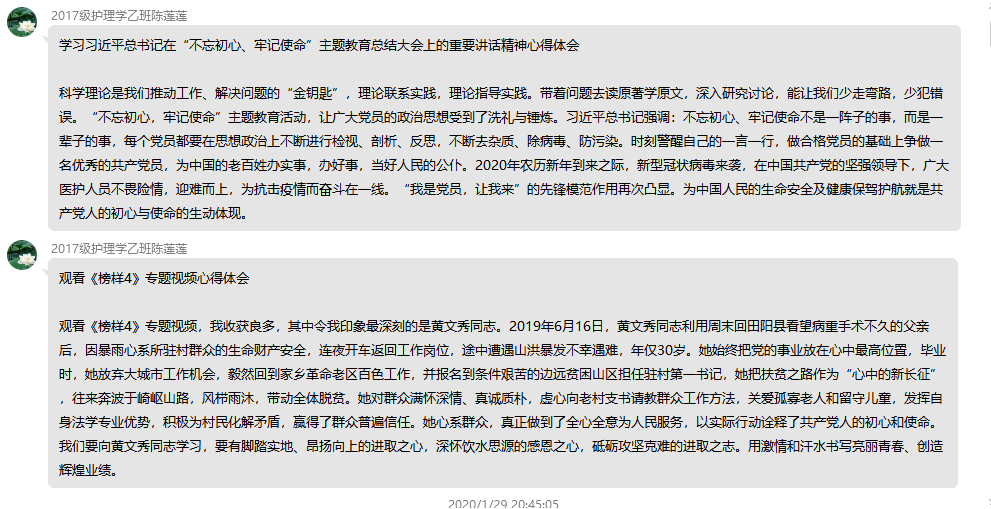 作为一名党员,作为一名医员工,更要不忘初心、牢记使命,勇于面对各种挑战,在投身疫情防控志愿服务中展现当代青年的奉献精神和专业担当。——2016级护理学乙班党员余佳丽