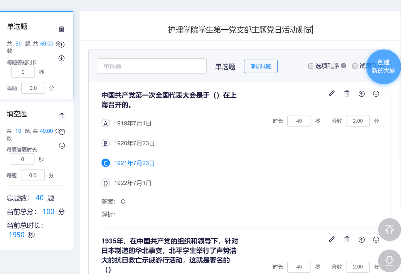 本次线上测试设置单选、填空等题型,并限制单题答题时长,题目源于学习强国挑战答题题库、党建知识参考题库等,内容涵盖了党史、新中国史、改革开放史、社会主义发展史、新冠肺炎疫情防护知识、党规党纪等内容,针对性强、覆盖面广。答题结束后,经过系统评阅,时璇、罗国淋、郭世鸿三位同志获得本次测试的前3名。