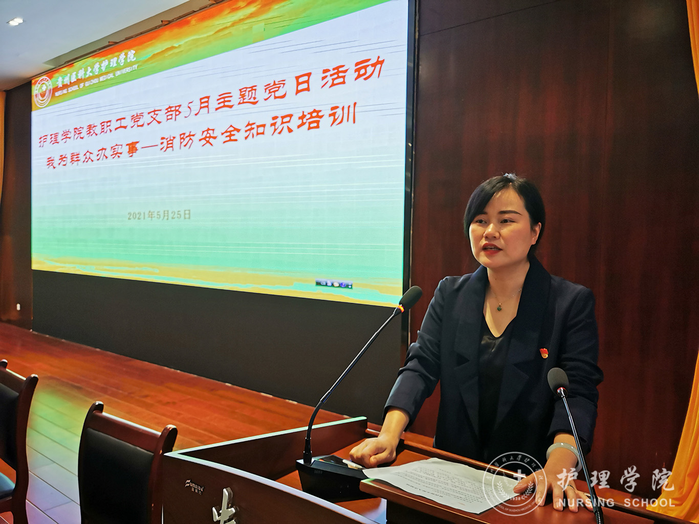为深入开展党史学习教育,切实将学习教育成果转化为为群众办实事的实际行动。5月25日,太阳成集团tyc234cc教职工党支部开展“我为群众办实事——消防安全知识培训”主题党日活动。本次活动由教职工党支部书记张仁莉同志主持,教职工党员及员工代表一百七十余人到场参加。