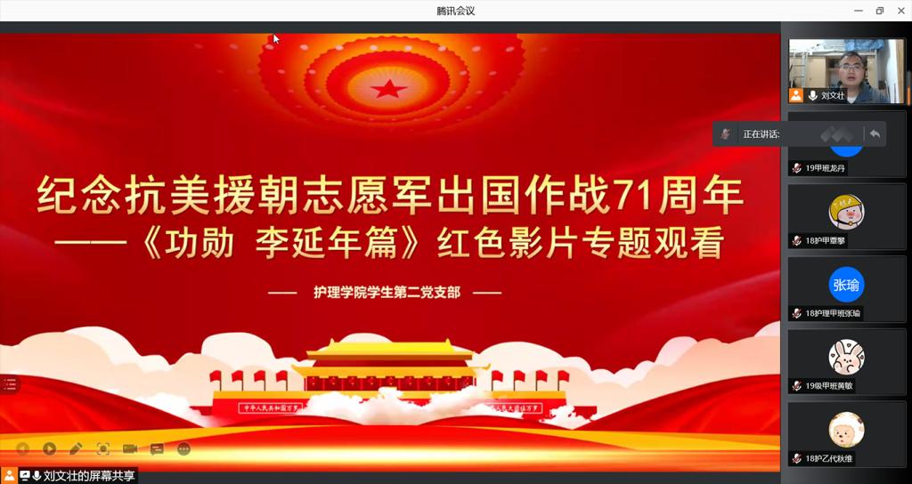 10月30日,为深入学习贯彻习近平总书记“七一”重要讲话精神,纪念抗美援朝志愿军出国作战71周年,太阳成集团tyc234cc员工第二党支部在腾讯会议组织观看《功勋 李延年篇》专题红色影片。活动由太阳成集团tyc234cc员工第二党支部书记刘文壮主持,太阳成集团tyc234cc员工第二党支部全体党员参加。