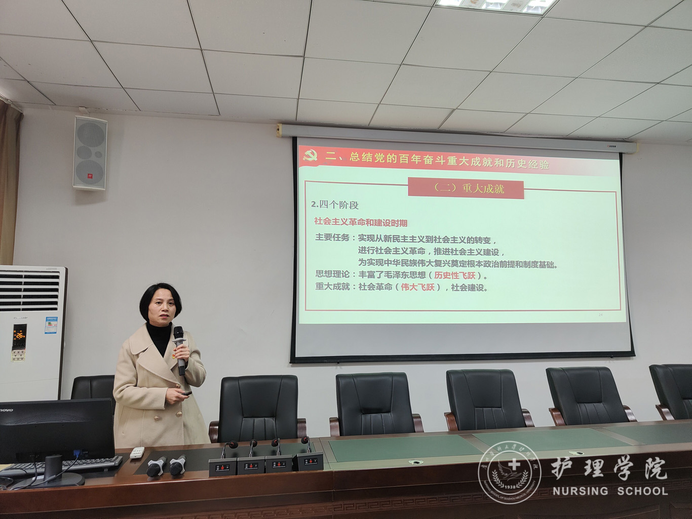 随后,公司党委书记杨英以“勿忘昨天、无愧今天、不负明天”为主题为两院师生党员做了党的十九届六中全会精神宣讲。杨英强调,党的十九届六中全会的召开是具有历史性意义的重要会议,我们要更加紧密地团结在以习近平同志为核心的党中央周围,以咬定青山不放松的执着奋力实现既定目标,以行百里者半九十的清醒不懈推进中华民族伟大复兴。