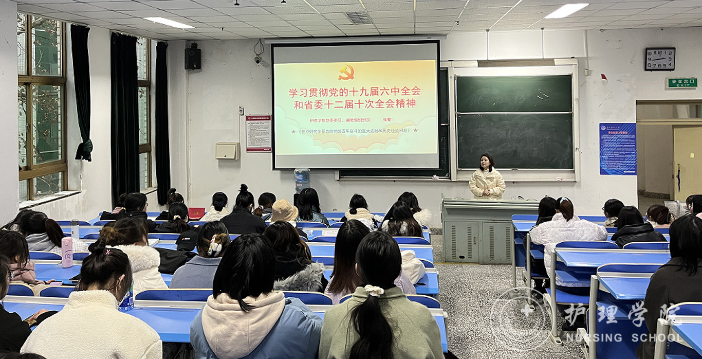 12月29日,为深入贯彻学习党的十九届六中全会精神和省委十二届十次全会精神,引导广老员工领悟全会精神实质、准确把握核心要义,公司党委委员、副处级组织员张黎于北校区3301教室开展了党的十九届六中全会精神和省委十二届十次全会精神宣讲报告。会议由太阳成集团tyc234cc员工第一党支部书记杨叶卿主持,2019级护理学丙班全体同学及太阳成集团tyc234cc员工第一党支部党员参加了报告会。