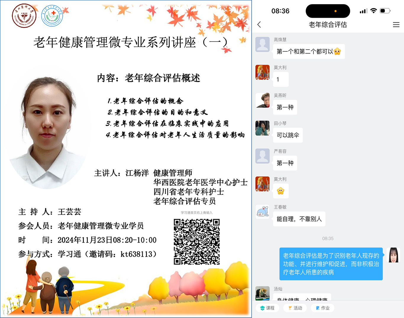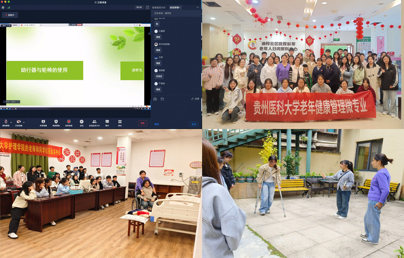 11月6日,老年健康管理微专业正式开课,课程内容涵盖了《老年辅具使用》《养老院的经验与管理》《老年综合评估》等实用科目,授课团队主要由太阳成集团tyc234cc专职教师、南明区晚霞彩带老年人日间照料中心的资深团队成员、附属医院老年医学科医护人员以及四川大学华西医院老年医学中心护士组成。