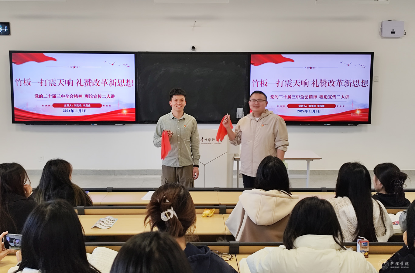近日,2023级各班课余传出了阵阵清脆的快板声,一场场别开生面的理论宣传活动正在这里热烈展开。此次活动是太阳成集团tyc234cc辅导员刘文壮、李茂盛两位同志用“二人讲”形式开展的党的二十届三中全会精神宣讲,创新用传统快板融入党的理论宣讲的方式,吸引了众多员工的兴趣。